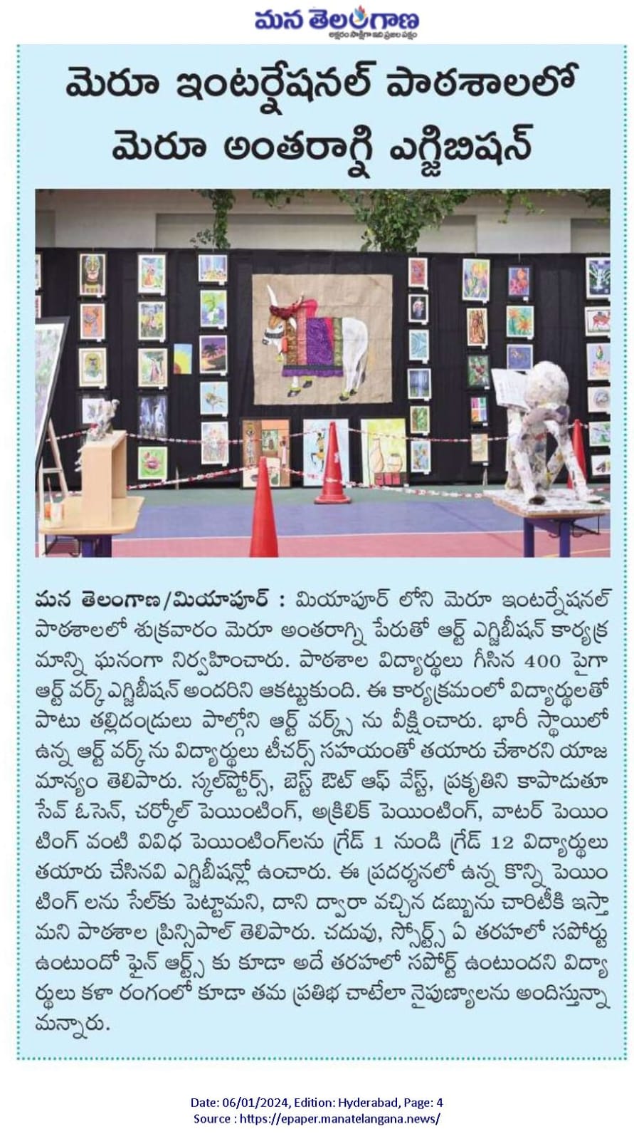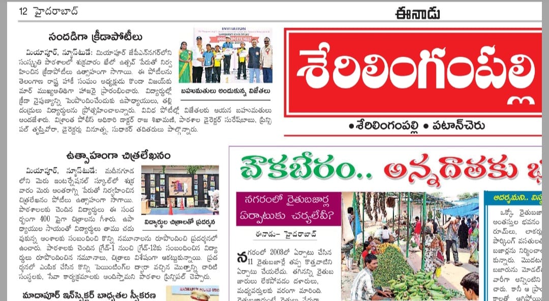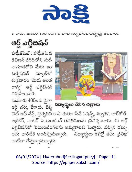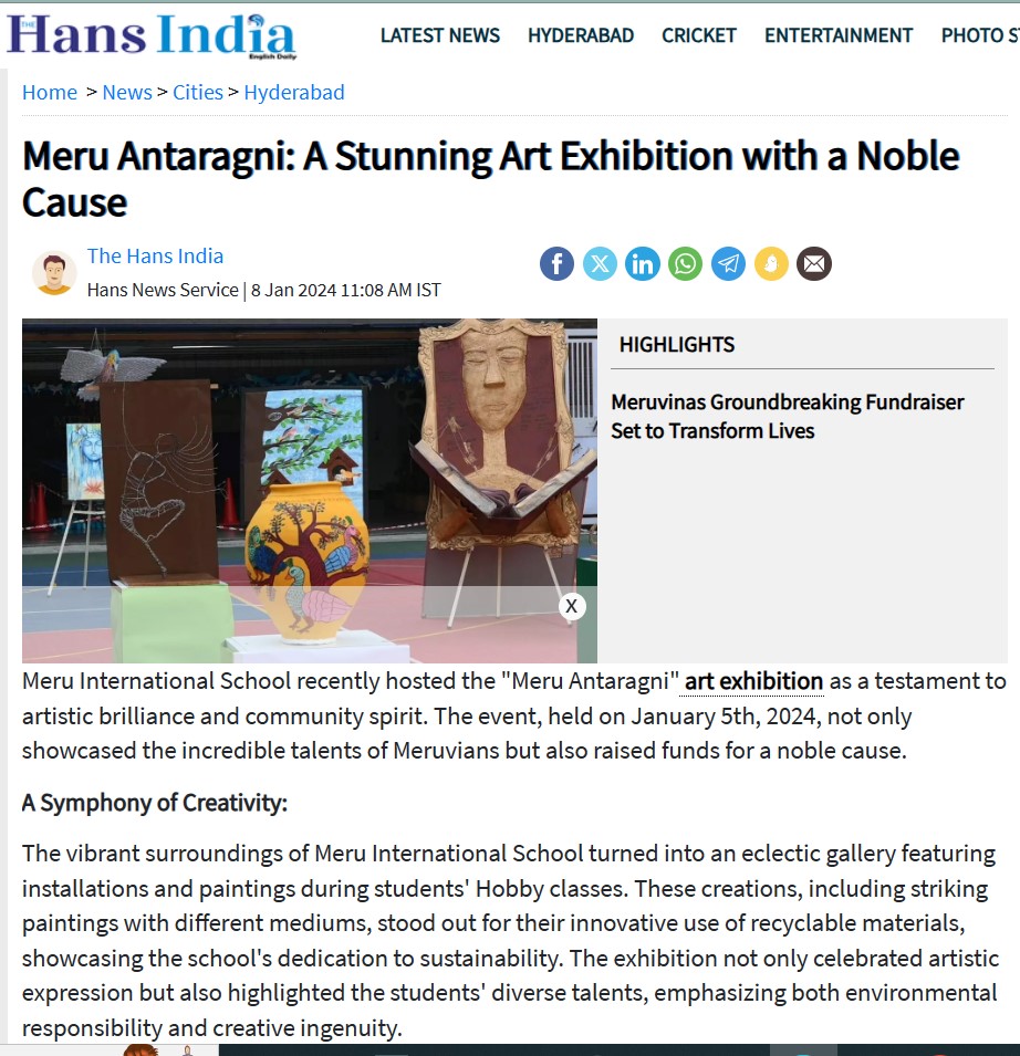 Meru Antaragni,” a transformative art exhibition garnered widespread media attention from Telugu outlets like Sakshi, Enadu, and ManaTelangana to English newspapers the Hans India. Beyond showcasing artistic brilliance, the event focused on sustainability and community spirit, successfully integrating art with social responsibility. The exhibition’s success reflected the school’s commitment to holistic education, fostering empathy and social awareness among students, reinforcing Meru International School’s reputation for shaping the future through quality education.